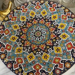 Vibrant mandala pattern with intricate details. Features blue, red, yellow, and green colors.