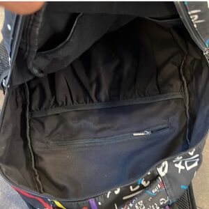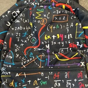 Vibrant backpack with math equations and symbols. Features a colorful design on a black background.