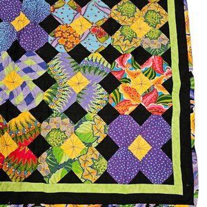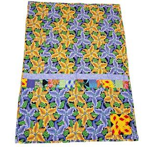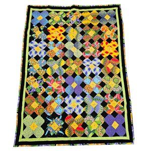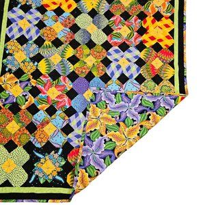 Add a splash of color to your home with this handmade quilt with Jan Sassman fabric. Featuring a maximalist style with a patchwork pick-a-posie technique, this lap-sized quilt is a unique work of art. The dominant colors are a vibrant mix of hues that will brighten up any room. It gives a tripical vibe with a backing of purple and orange lilies