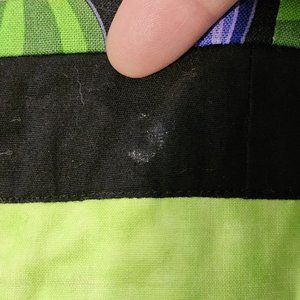 Few tiny blemishes on edge. I was afraid to wash it in case the colors bled. May have storage odor.