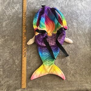 Vibrant mermaid backpack with rainbow colors. Features a smiling face and colorful tail.