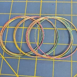 Set of vibrant metallic bangles. Features red, gold, and green colors. Perfect for adding a pop of color to any outfit. Each blue Sq on table is 1" for size reference