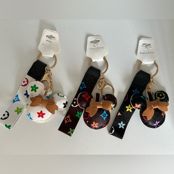 Set of colorful Mickey Mouse keychains with bows. Features vibrant designs on white, brown, and black backgrounds.