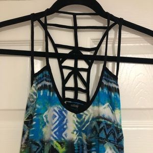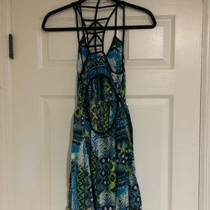 Embrace summer vibes with this Millau back cutout, side-zip dress in a vibrant Aztec pattern of blue, green, and black. Whether it's a beach cover-up or a casual date night, this dress is your go-to choice for effortless style. Lightly washed and worn, it exudes both comfort and chic. Elevate your summer wardrobe with this versatile and trendy piece!