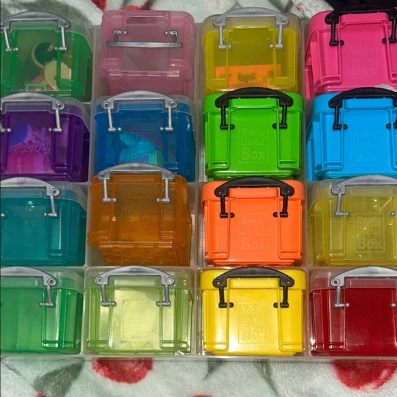 Set of small translucent plastic storage boxes in assorted bright colors. Stackable mini utility boxes with front latch detail. Great for organizing small toys, trinkets, or craft supplies. Vibrant mix of green, pink, yellow, blue, orange, purple, red, teal, and clear tones.