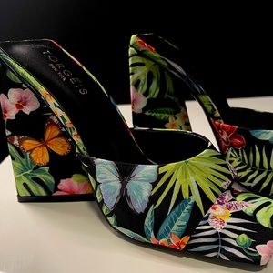 ๐ด absolutely stunning block heeled mules with a black bass and vibrant tropical pattern that includes butterflies, monstera leaves, and orchids. These shoes come in their original packaging and have never been worn. These would be amazing shoes for the summer โ๏ธ