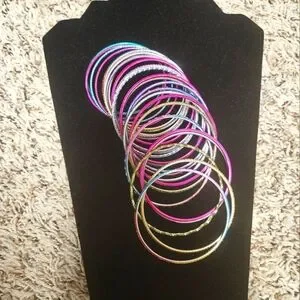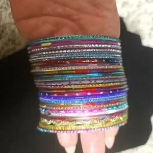 Add a splash of color to your outfit with this vibrant multi-bangle set. Featuring a stunning array of colors, these bangles are perfect for any occasion. Worn twice, like new!