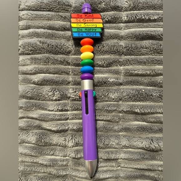 Brighten up your day with this colorful multi-function pen. Featuring vibrant colors like purple, yellow, and blue, it's perfect for creative play and writing. Encourage positivity with its cheerful design.