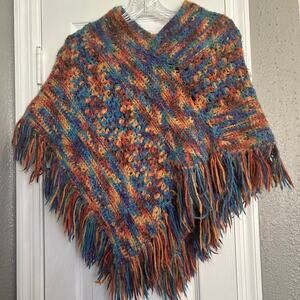 Colorful Multicolor Knit Fringe Poncho Shawl Boho Sweater Wrap