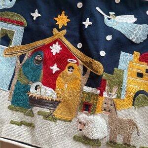 Vibrant tapestry featuring a nativity scene with angels and animals. Perfect for holiday decor. 14x26