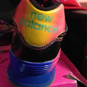 Colorful new balance with pink and blue detailing at the bottom. The shoe strings are pink and purple.