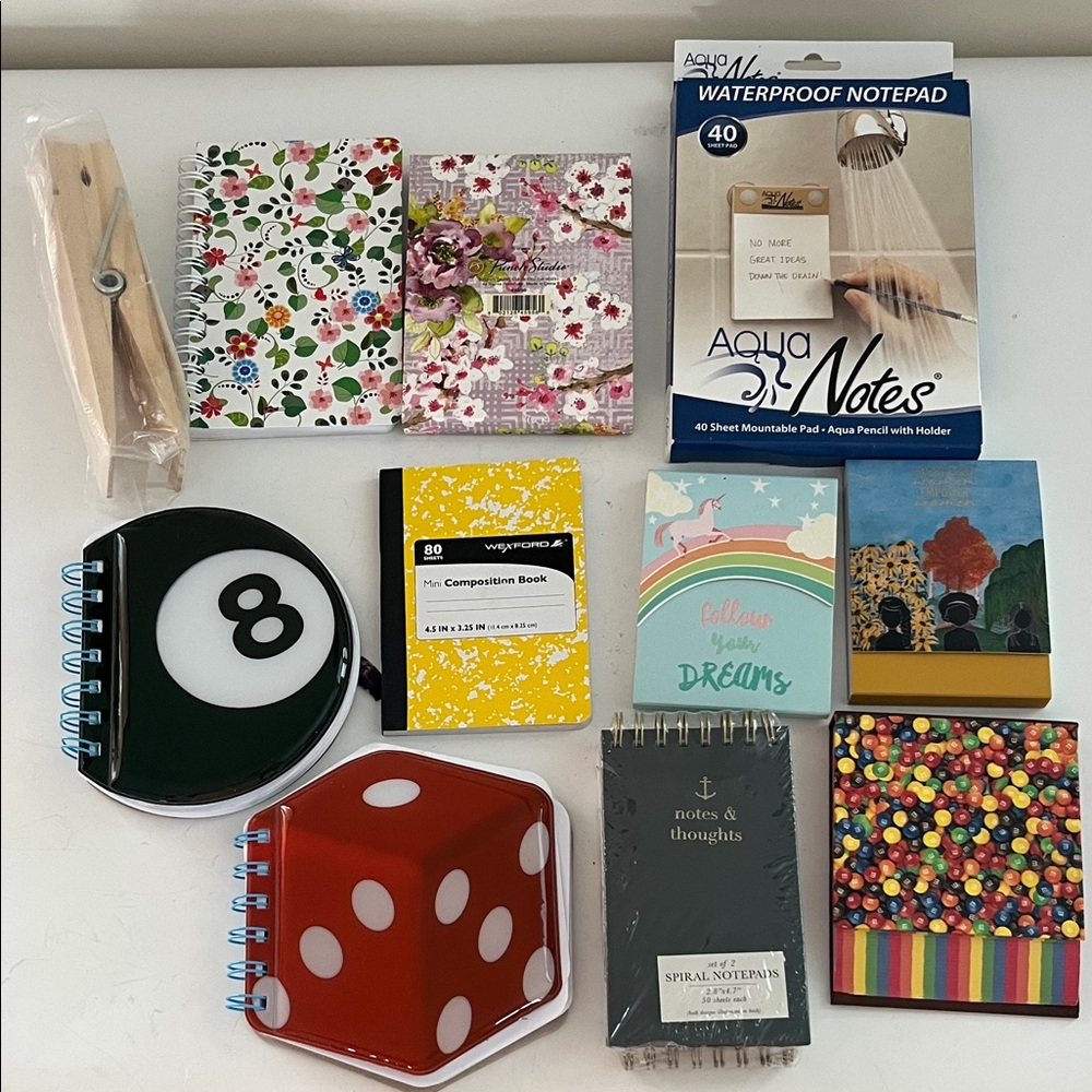A vibrant collection of (11) notebooks and notepads. Includes floral, polka dot, and themed designs. Perfect for notes and journaling. Includes clothes pin style note holder.