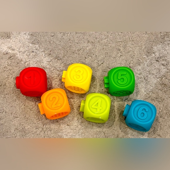 Set of 6 interlocking blocks. Each block side has different pictures. Soft and flexible.