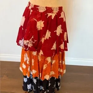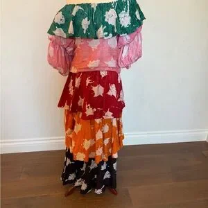 Vibrant off-shoulder top and skirt with ruffle details. Features green, pink, red, orange, and black layers with floral patterns.
