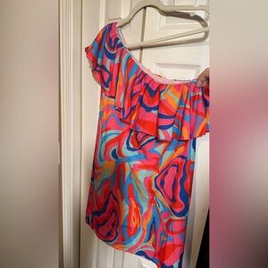 Vibrant off-shoulder dress with ruffle detail. Features a multicolor abstract pattern.
