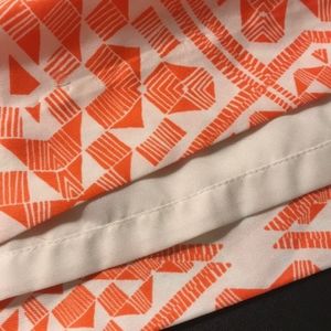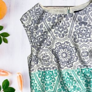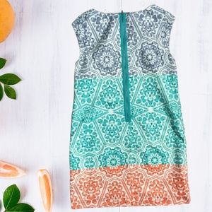 Gorgeous abstract floral medallion print with gray-blue/green/orange colors. Perfect for spring and summer. Fully lined. Slight cap sleeve. EUC.