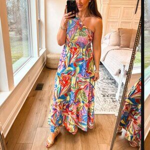 Colorful One-Shoulder Maxi Dress with Vibrant Tropical Print Size Medium