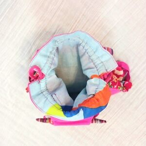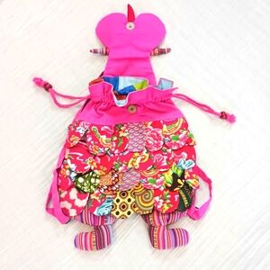Vibrant owl-shaped backpack with floral patterns. Features bright pink, red, and multicolor designs. Perfect for adding a fun touch to any outfit.