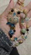 It showcases a mix of gold, pink, green, blue, and black beads, creating a stunning visual appeal.