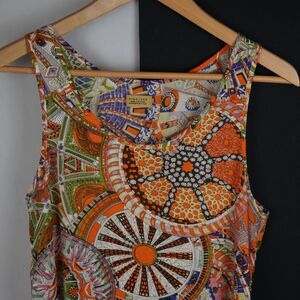 The tank top boasts a complex and eye-catching pattern with a mixture of geometric and floral designs in vibrant colors, making it a unique piece. Its sleeveless design and soft fabric provide great comfort during summer days or can be layered under a jacket for a stylish look.