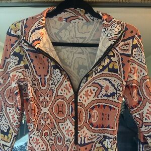 Make a bold statement in this vibrant, bohemian-inspired jumpsuit featuring an intricate geometric and paisley pattern in coral, navy, and white tones. The sleek zip-front design adds a modern edge, while the fitted silhouette flatters every curve. Crafted from a soft, stretchy fabric that moves with you, this piece is perfect for festival days, creative events, or a night out when you want to stand out. Effortless, eye-catching, and comfortable—this jumpsuit is a showstopper
