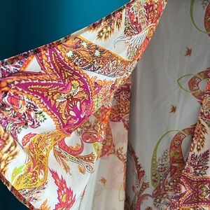Vibrant sleeveless cardigan with a paisley pattern. Features shades of orange, pink, and cream. Perfect for layering. Beach or over a cute tank! Super cute