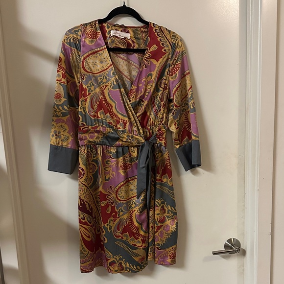 Vibrant wrap dress with a paisley pattern. Features a mix of red, pink, and gray colors. Perfect for a stylish look.