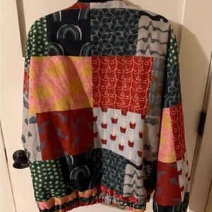 Vibrant patchwork bomber jacket. Bold geometric and abstract prints. Front zip closure and elastic cuffs. Eye-catching multicolor look for casual wear.