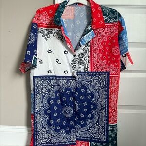 Vibrant patchwork button-up shirt featuring red, blue, and green patterns. Perfect for a bold, stylish look.