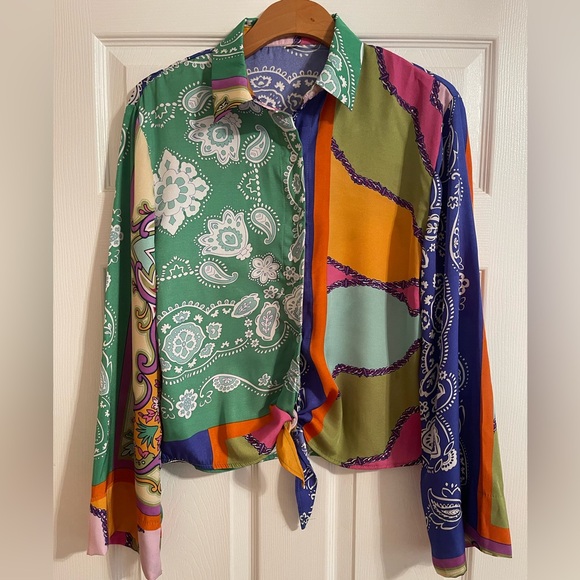 Vibrant patchwork button-up shirt with a mix of green, orange, blue, and purple patterns. Features a tie front for a stylish look.