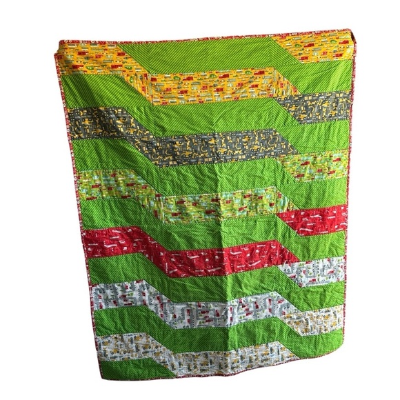 Brighten your bedroom with this vibrant patchwork quilt. Featuring a mix of green, red, and yellow hues, this quilt adds a lively touch to any decor.
