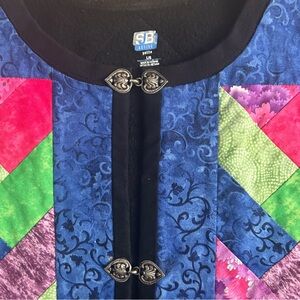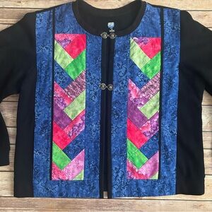 Vibrant cardigan with colorful patchwork design. Features blue, pink, green, and black hues. Custom made.