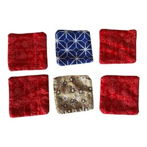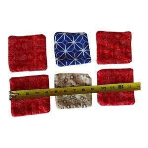 Set of six colorful patchwork coasters. Features vibrant patterns in red, blue, and black.