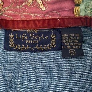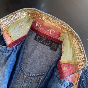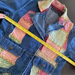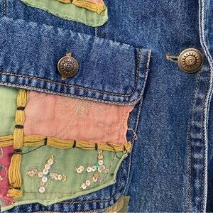 Unique denim jacket with colorful patchwork design. Features red, green, and pink patches with embellishments.