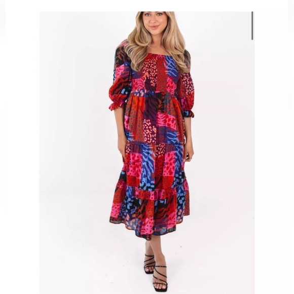 Vibrant and stylish, this colorful patchwork dress is perfect for any occasion. Featuring a mix of red, pink, and blue hues, it adds a pop of color to your wardrobe. The dress offers a comfortable fit with its flowing design.