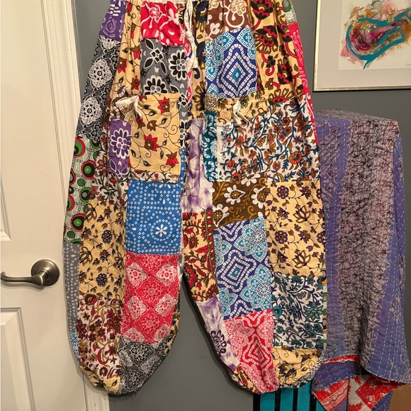 Vibrant patchwork harem pants with a mix of patterns. Features red, blue, yellow, and brown patches.
