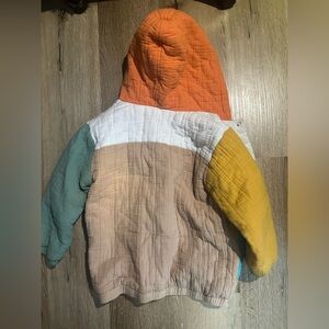 Vibrant patchwork jacket with a hood. Features orange, yellow, green, and blue patches. Perfect for a bold look.