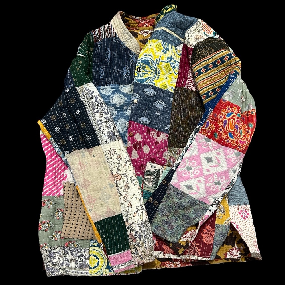 Vibrant patchwork jacket with a mix of patterns and colors. Perfect for a bold fashion statement.