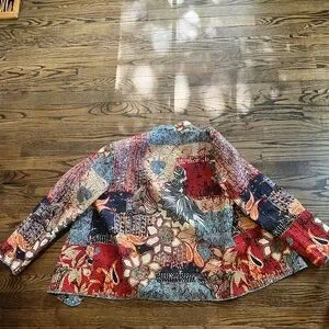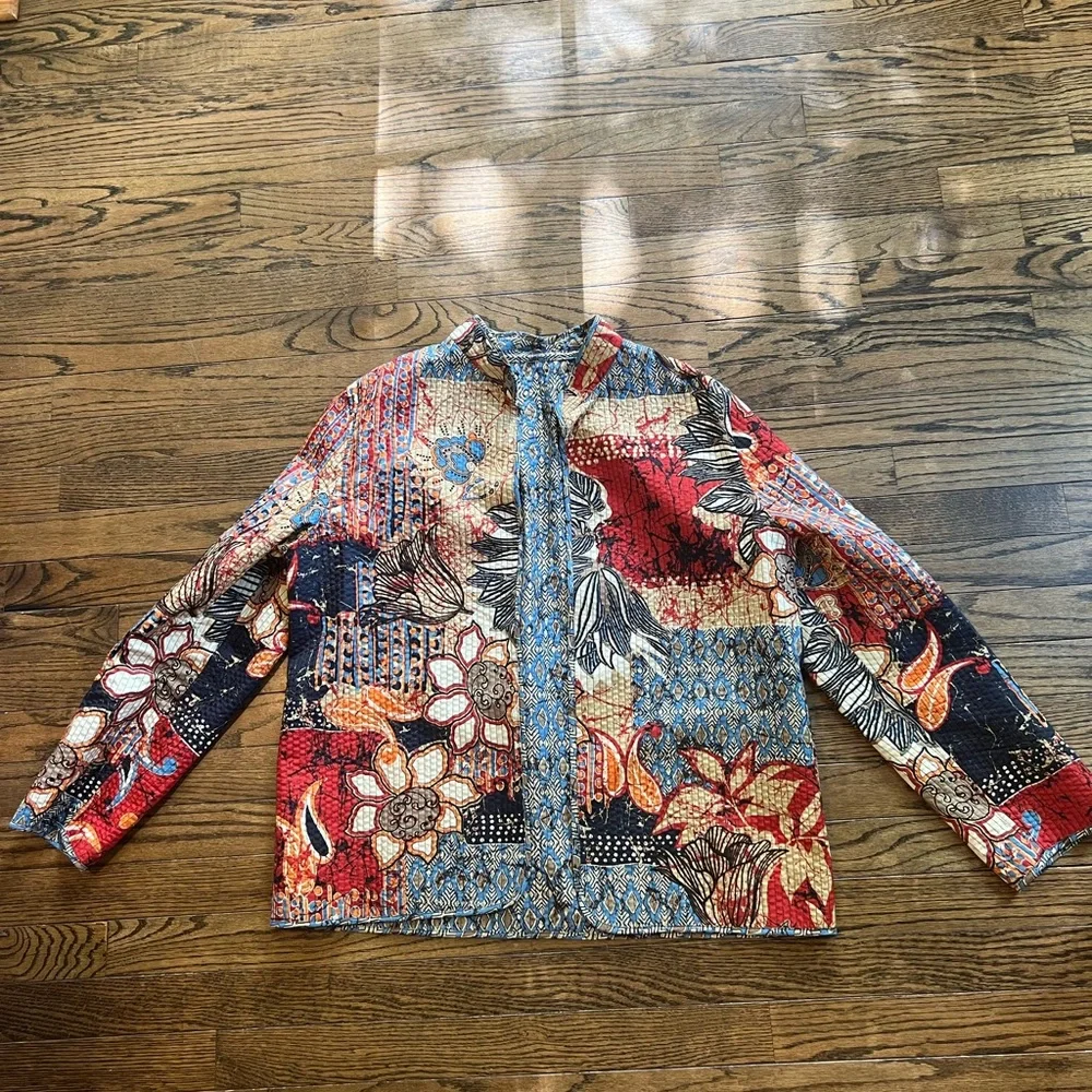 Vibrant patchwork jacket with floral and abstract patterns. Features a mix of red, blue, and orange hues.
