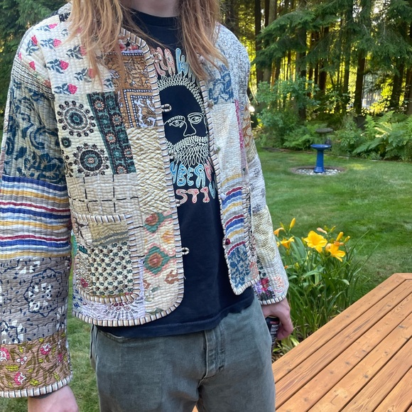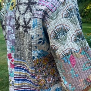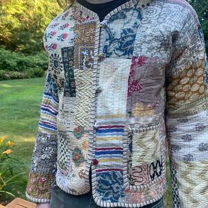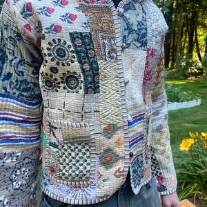 Vibrant patchwork jacket with a mix of patterns. Features multicolor designs for a unique look. Great light weight jacket, buttons in the front. Tag says xl, but fits like woman’s medium.