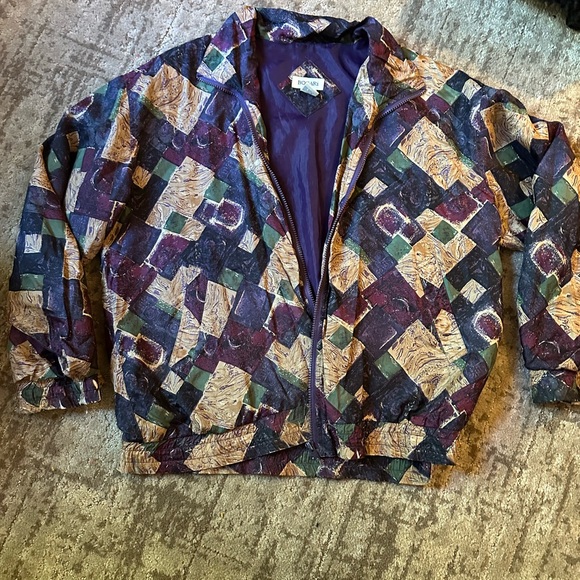 Vibrant patchwork jacket with a mix of colors. Features a zip-up front and a unique design.