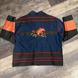 Vibrant patchwork jacket with red, orange, and blue patterns. Unique design with button closure.