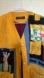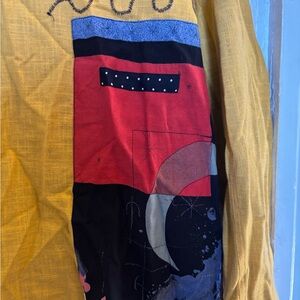 Vibrant yellow jacket with artistic patchwork design. Features multicolor abstract patterns and button closure.