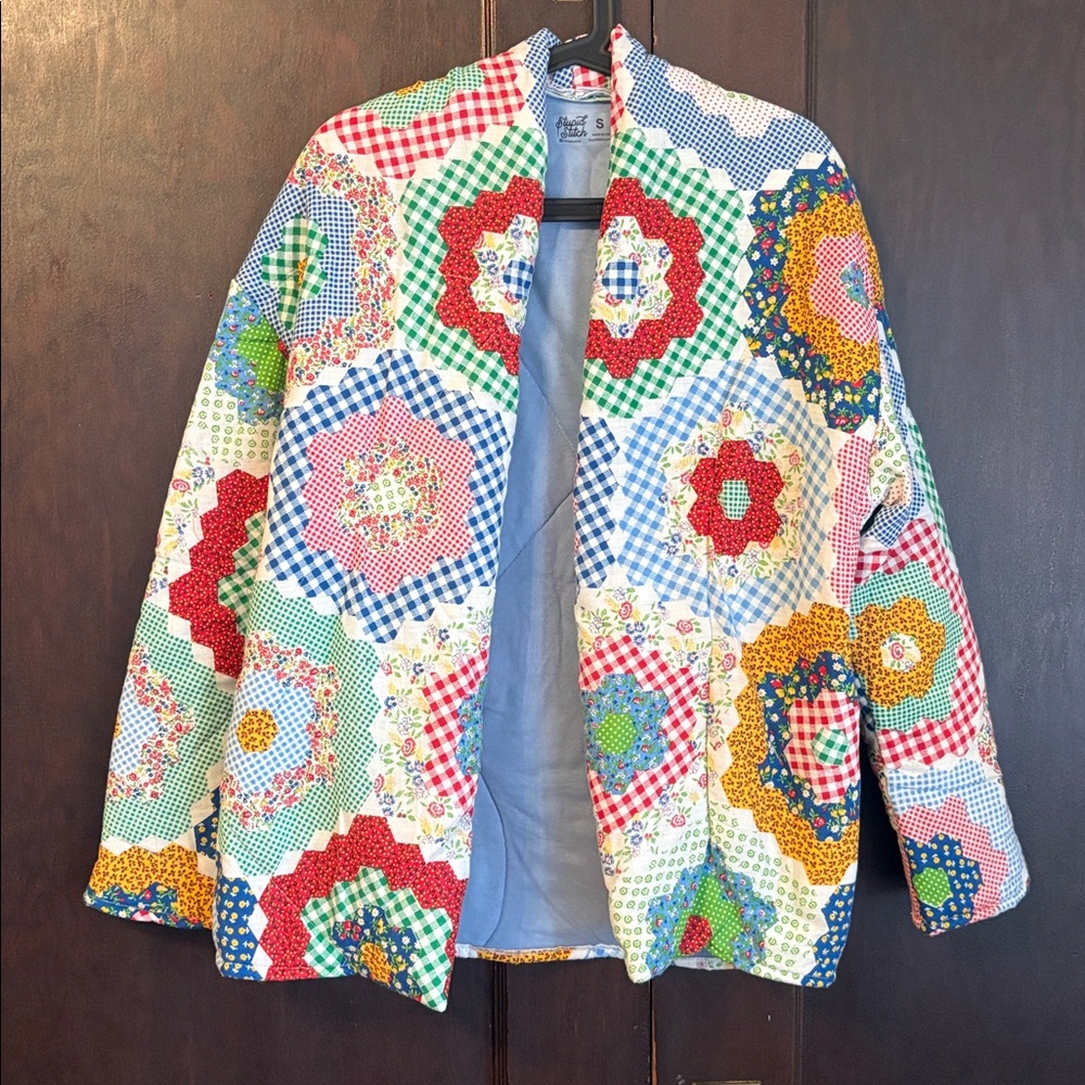 Vibrant patchwork jacket with a mix of colors. Features a unique hexagon pattern. Made from vintage blanket. Cozy and COMFY