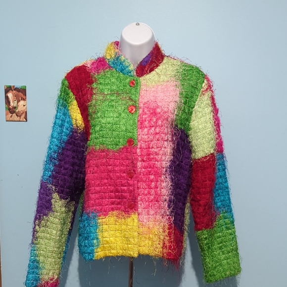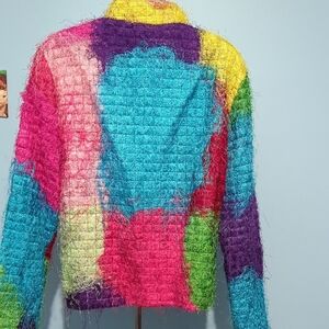Vibrant patchwork jacket with a mix of colors. This jacket is very bright in colors. Will make a great Conversation starter when out and about. It's very Stylish and Comfortable. Size Medium. Length measures 23 inches. Pit to Pit measures 20.5 inches.Does contain shoulder pads