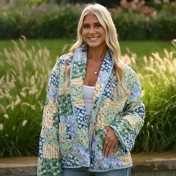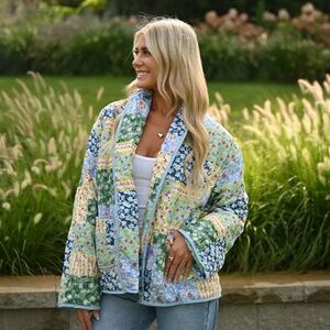 Vibrant patchwork jacket with floral patterns. Features blue, green, yellow, and pink patches.
