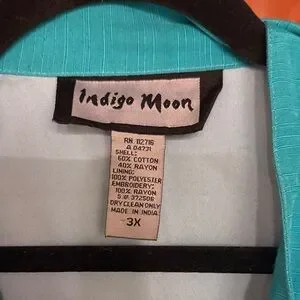 Vibrant patchwork jacket with button closure. Features shades of teal, blue, and white.
