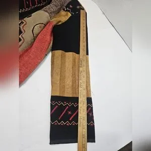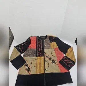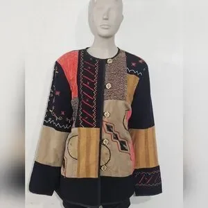 Vibrant patchwork jacket with unique patterns. Features red, black, and tan colors.