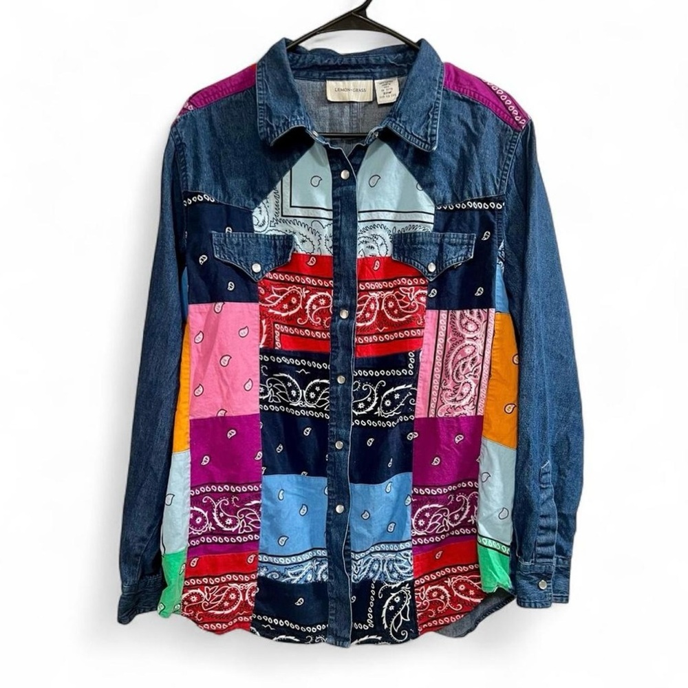 Vibrant patchwork jean jacket with a mix of colors for a bold look. Perfect for making a statement. bandana details pearl snap buttons I would say men and women could wear this and rock it!!