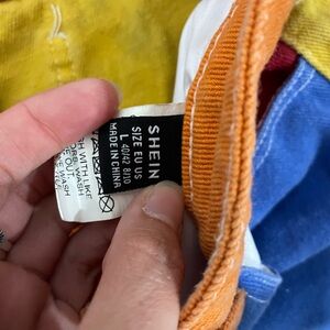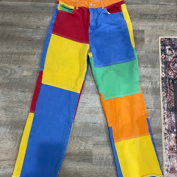 Vibrant patchwork jeans with red, blue, yellow, green, and orange panels. Perfect for a bold fashion statement.